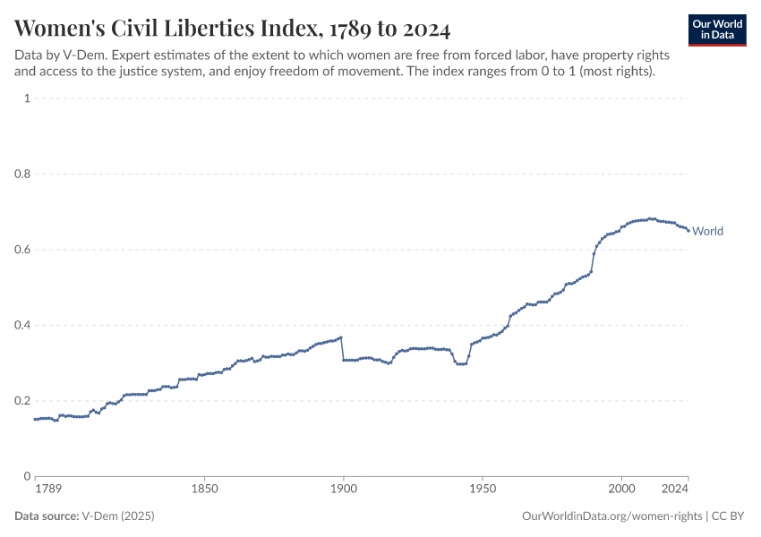 V-Dem (2025) – processed by Our World in Data. “Women's civil rights index – V-Dem” [dataset]. V-Dem, “Democracy report v15” [original data]. Retrieved February 28, 2026 from https://data-diet-americans.owid.pages.dev:8789/20260119-070102/grapher/women-civil-liberties-index.html (archived on January 19, 2026).