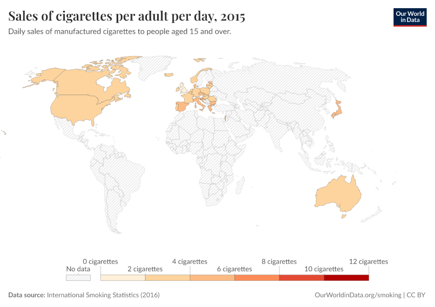 In the visualization, we see the average number of cigarettes sold per adult per day across many of today's rich countries, including the United States and European countries.