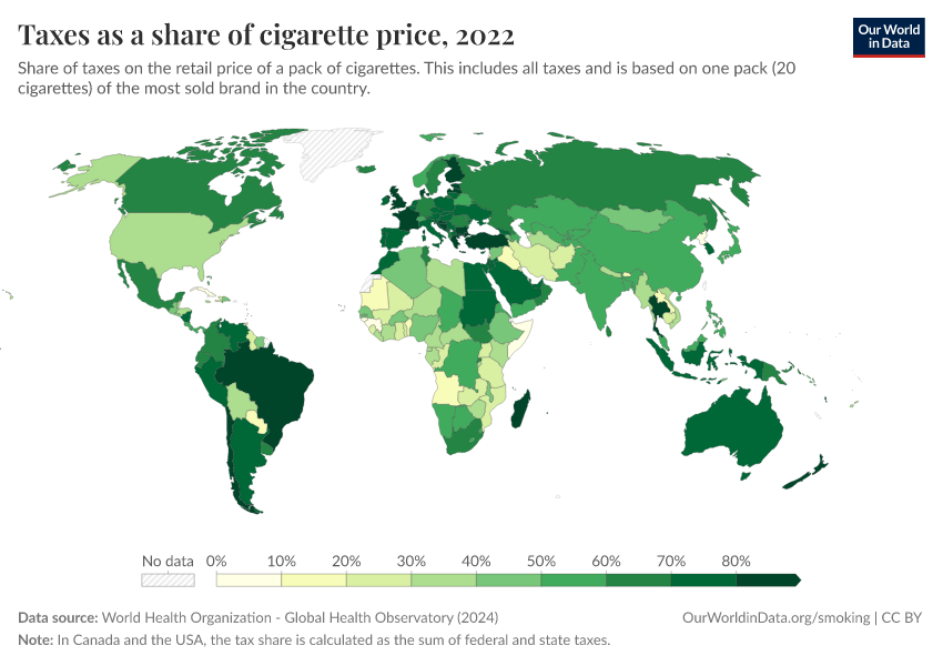 We see that daily smoking is most common across Europe and Asia – more than 20% of people in most countries in these regions smoke every day.