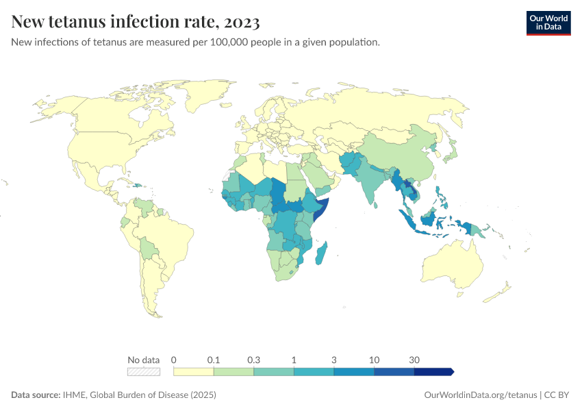 But by 2019, infection rates had declined in many countries, and only a few countries worldwide had infection rates of tetanus greater than 5 per 100,000 people per year.