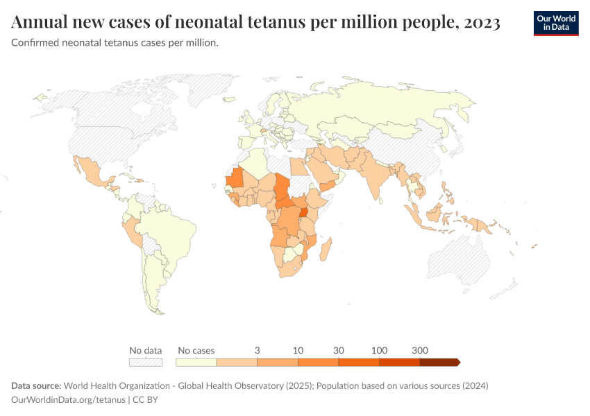 Notably, if you switch the country in the chart to any high-income country or region, such as Central Europe, you will see that tetanus in children is very uncommon in those places.