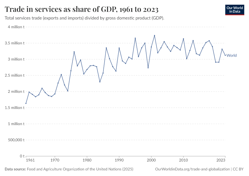 Indeed, if you compare the chart showing the global trade openness index and the chart showing global merchandise exports as a share of GDP, you find that the former is almost twice as large as the latter.