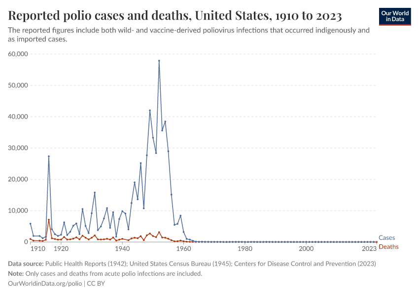 Polio is another example. The poliovirus spreads through contaminated water, attacks the nervous system, and can cause breathing problems and paralysis. Like measles, polio can spread silently among those with mild or no symptoms, making high vaccination coverage essential. Jonas Salk’s inactivated polio vaccine, introduced in 1955, and Albert Sabin’s oral polio vaccine, introduced in 1960, stopped transmission and dramatically reduced cases.